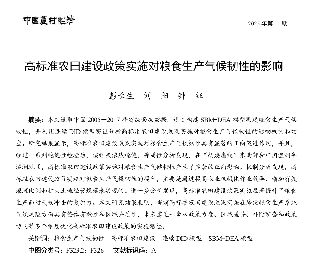 近日,我院2023级统计学研究生刘阳与导师彭长生教授在国内农村经济研究领域顶尖期刊《中国农村经济》2025年第11期发表学术论文《高标准农田建设政策实施对粮食生产气候韧性的影响》。《中国农村经济》系国家社会科学基金首批重点资助期刊、国家自然科学基金委员会管理科学部认定的管理科学重要学术期刊、中文社会科学引文索引(CSSCI)来源期刊。期刊综合影响因子为14.085,在农业经济类学术期刊中排名第一,在13个经济学学科的514种学术期刊中排名第三。