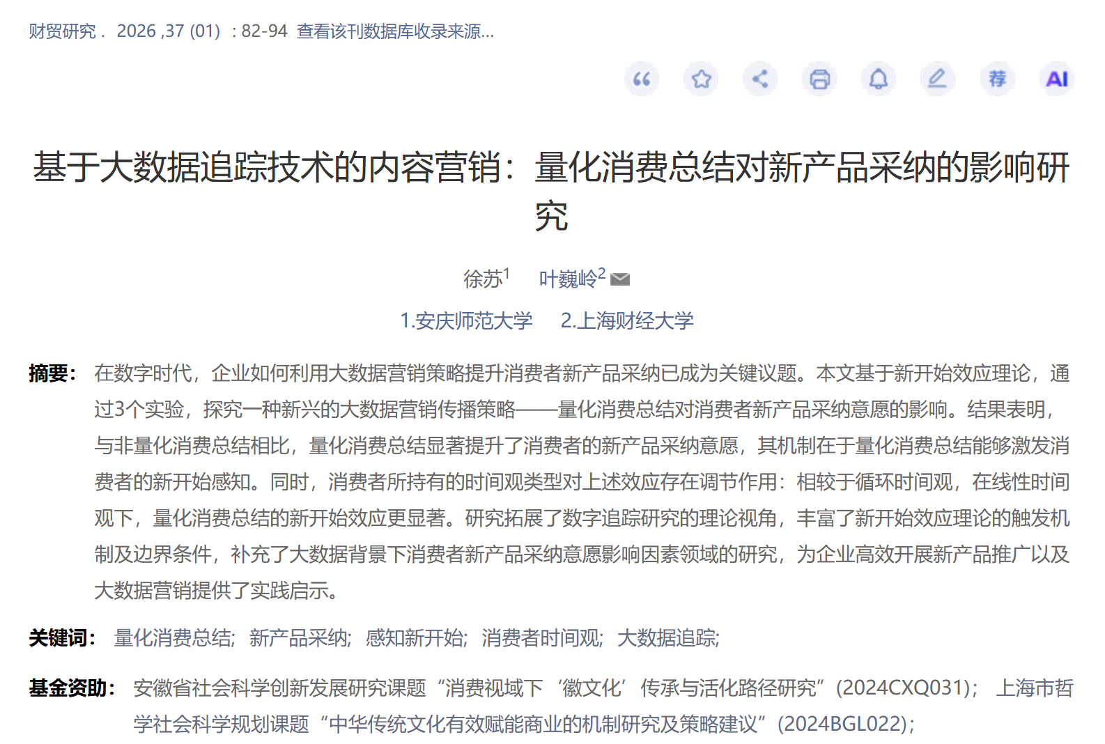 近日,数字营销教研室徐苏博士为第一作者的论文《基于大数据追踪技术的内容营销:量化消费总结对新产品采纳的影响研究》刊发于《财贸研究》2026年第一期。《财贸研究》系中文社会科学引文索引(CSSCI)来源期刊,FMS管理科学高质量期刊,2025年综合影响因子为4.03。