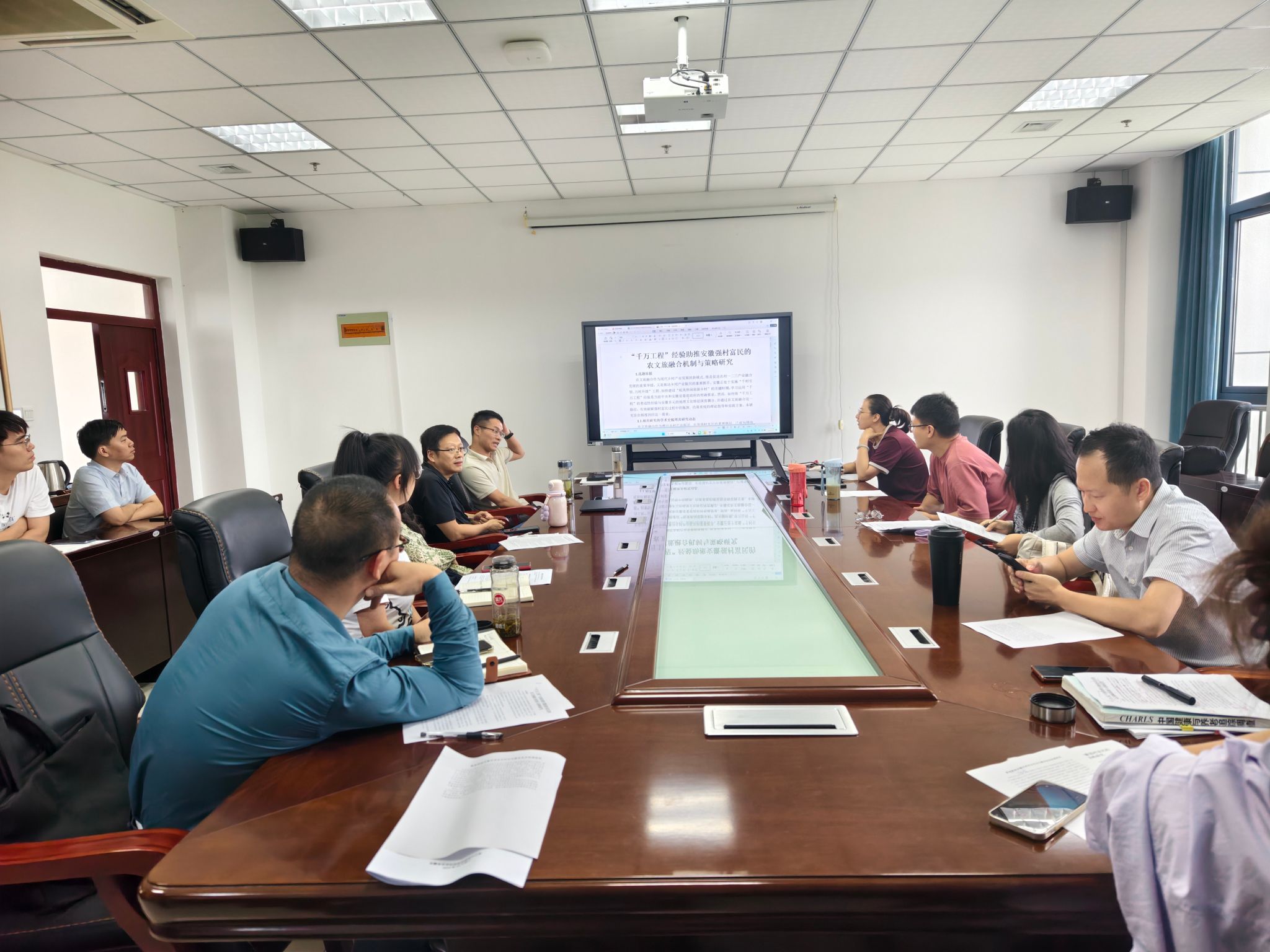 在研讨环节,与会教师围绕乡村振兴、人工智能应用、绿色发展、传统村落保护等方向,逐一汇报了选题思路与论证框架,并就研究方法、理论创新与实践路径展开深入交流。现场讨论热烈,提出了多项建设性意见,为后续申报书的完善奠定了扎实基础。