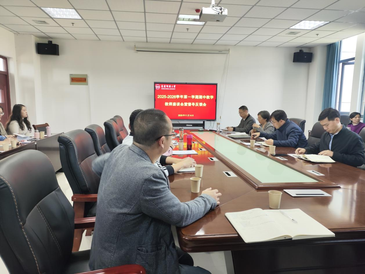 2025年11月14日中午,tyc7111cc太阳成集团于M207会议室召开2025-2026学年第一学期期中教学检查教师座谈会暨督导反馈会。学院党委书记刘燕杰、院长徐俊杰,校院两级督导老师及20余名中青年教师代表参会,会议由副院长黄光锋主持。