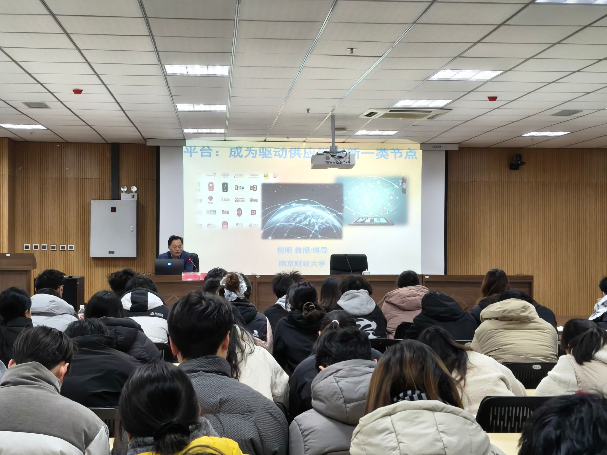 12月4日,由科研处、tyc7111cc太阳成集团联合主办,安徽省数字经济研究中心、tyc7111cc太阳成集团研究生党支部、预算绩效管理联合实训基地承办的“经管有道”第33期学术报告会成功举办。南京财经大学倪明教授应邀作题为“平台:驱动供应链创新一类节点”的学术报告,学院物流管理和金融工程专业师生参与学习,报告会由吕有清博士主持。
